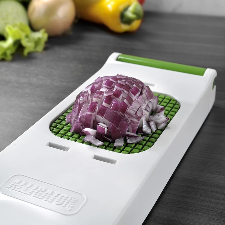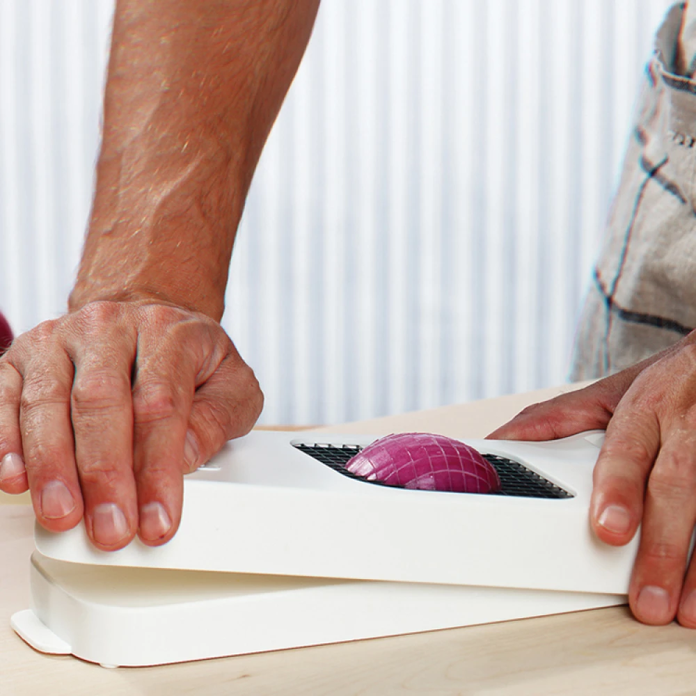 Du kan også bruge løghakkeren til mange andre grøntsager og frugter! Hak æble og kartofler fint eller lav smalle agurkestænger til dippen! Løghakkeren kan klare det meste og fordi du kan bruge hele armen til at presse overdelen ned, er den nem at bruge selv for dem med svage hænder.