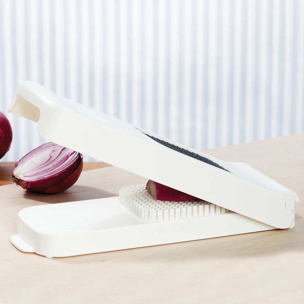 Løghakkeren er nem at bruge. Åbn løghakkeren, del løget i to og læg det på pladen. Tryk ned på toppen, så de skarpe knive skærer gennem løget. Hakkeren giver 6 x 6 mm finthakkede løg, som du kan lægge i en skål eller direkte i bradepanden.