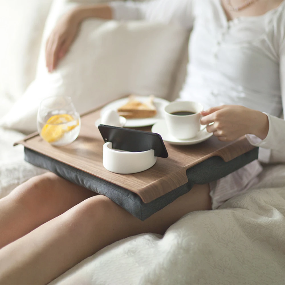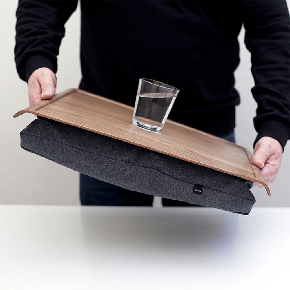 Nyd en god morgenmad på sengen eller arbejd med computeren i sofaen på denne luksuriøse knæbakke i valnøddetræ! Knæbakken fås i to praktiske størrelser og den skridsikre overflade gør, at det du lægger på pladen ikke glider væk.