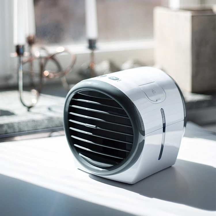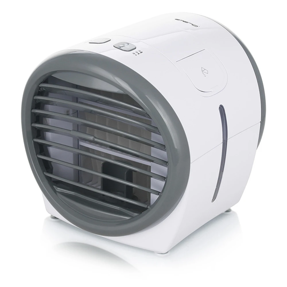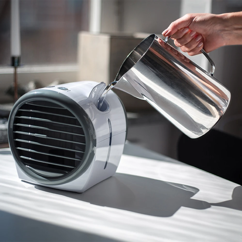 Bordventilatoren bruger vand som køleelement, hvilket betyder, at den køler bedre end en almindelig ventilator. Fyld det lille vandtrug og lad det kolde vand blive absorberet af køleblokken inde i bordventilatoren. Når luften blæser gennem køleblokken, giver det en rigtig cool og behagelig blæser.