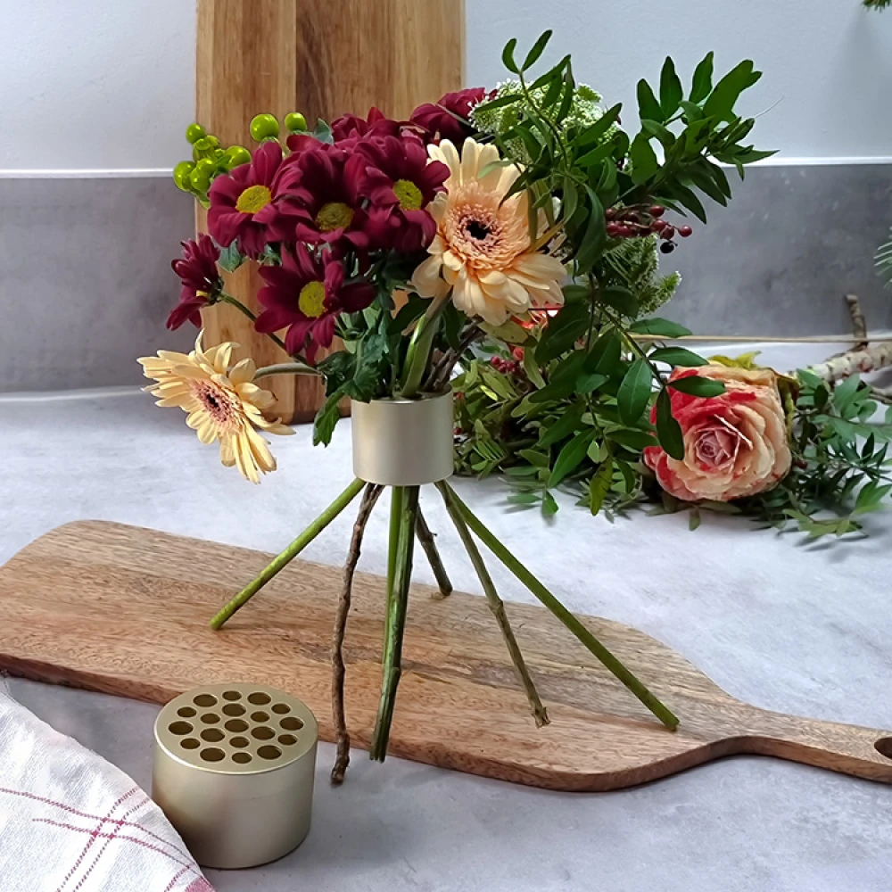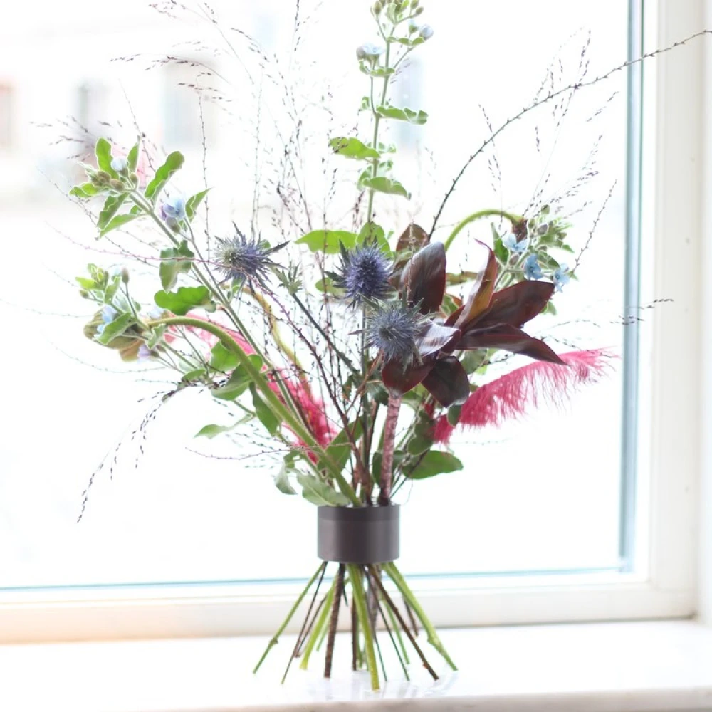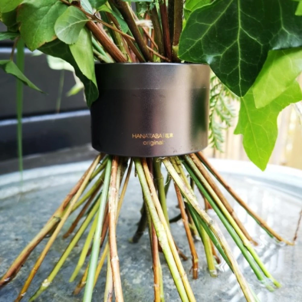 Med Hanataba buketholderen kan du skabe professionelle buketter på egen hånd. Stik de afskårne blomster gennem buketholderen, og med en lille drejning har du skabt en spiralbuket med masser af volumen. Fin at sætte i en vase og som også kan stå alene på et fad med vand.