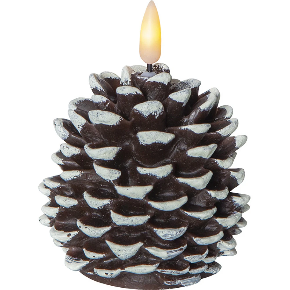 Denne smukke dekorative pejs har snedækkede skæl og en naturtro flamme, der lyser med en hyggelig varm hvid glød. Den brune og hvide vokskegle er fantastisk til indendørs dekoration og vil se godt ud på et bord, et vindue eller en bogreol.