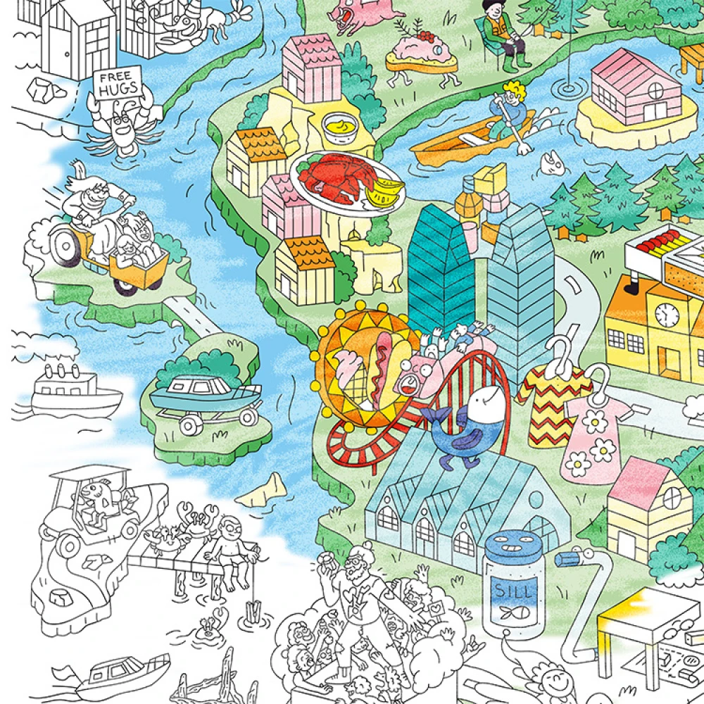 Plakaten er fuld af sjove figurer, og du vil opdage nye spændende detaljer, mens du maler. Hele familien kan hjælpes med at farvelægge de smukke motiver og det er lige så sjovt for både voksne og børn!