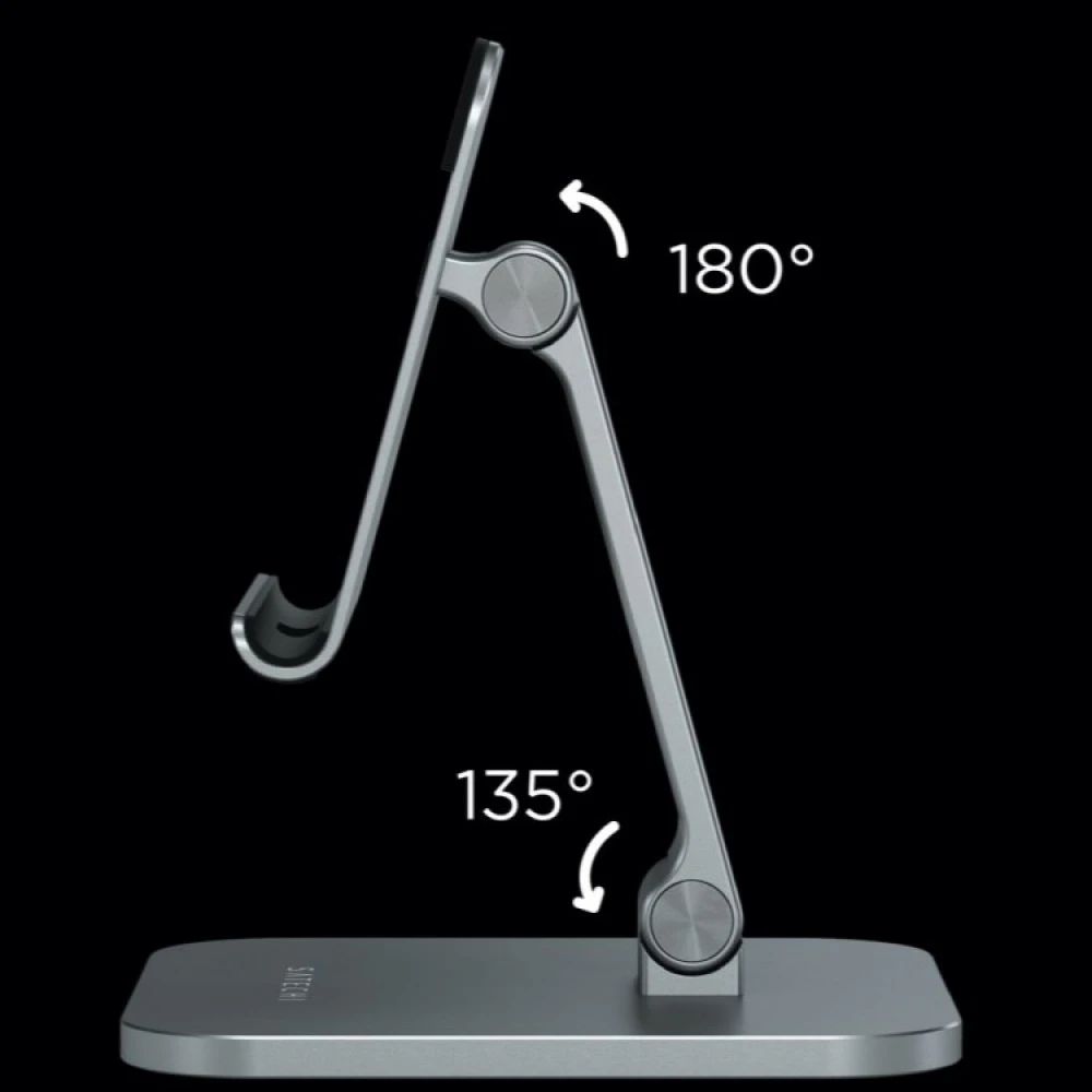 Den robuste aluminiumskonstruktion har to justerbare hængsler. Basen kan justeres 135° og beslaget kan justeres 180°. De to led gør det nemt at ændre højden og vinklen, så du får den optimale synsvinkel, uanset om din tablet ligger ned eller står op.