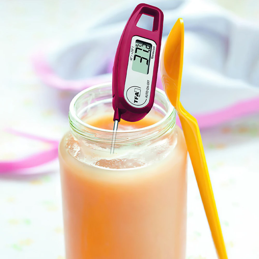 Køkkentermometeret er lille, fleksibelt og nemt at bruge. Målepinden er placeret på en foldearm og termometeret tænder automatisk, når du folder armen ud. Termometeret er lige så godt at bruge til forskellige typer drikke som til fisk, fjerkræ, okse- og svinekød. Perfekt, når du hurtigt vil vide, om fileten er klar, eller at vællingen ikke er for varm.