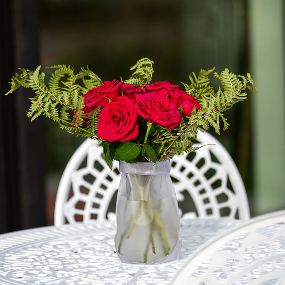 Den formbare vase fås i transparent, frost eller blå farve. Den flade og stilrene indpakning gør den nem at sende som gave.