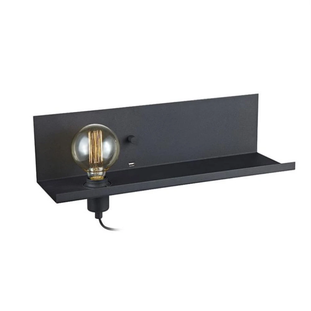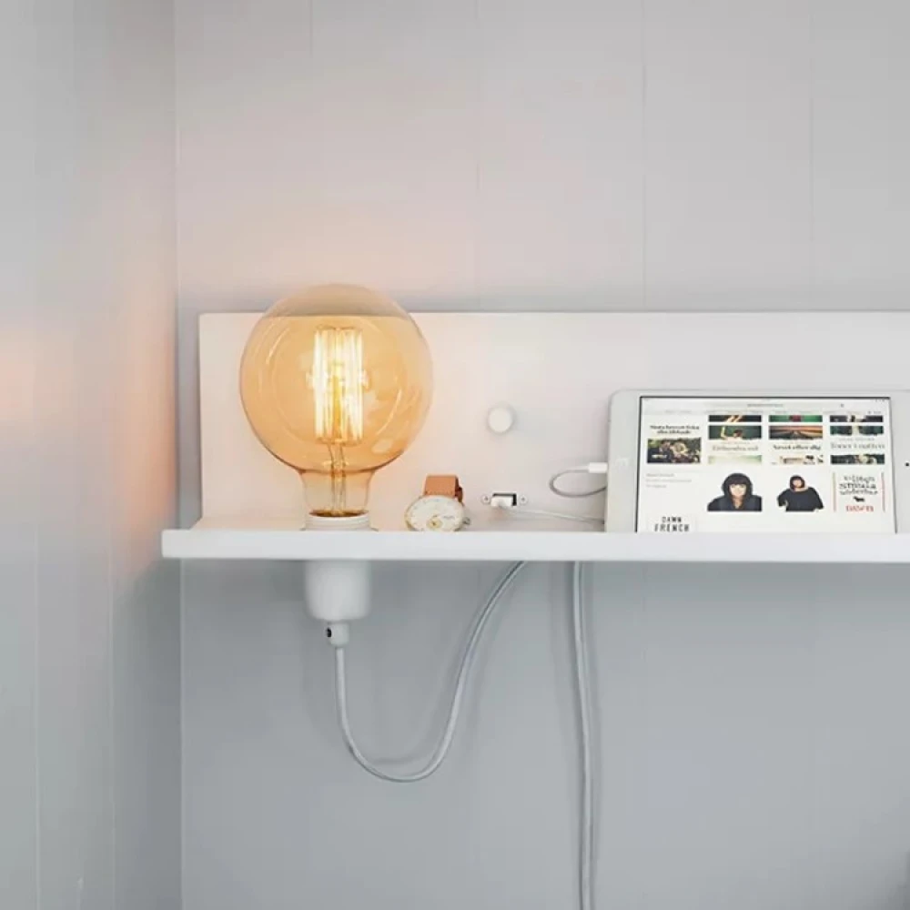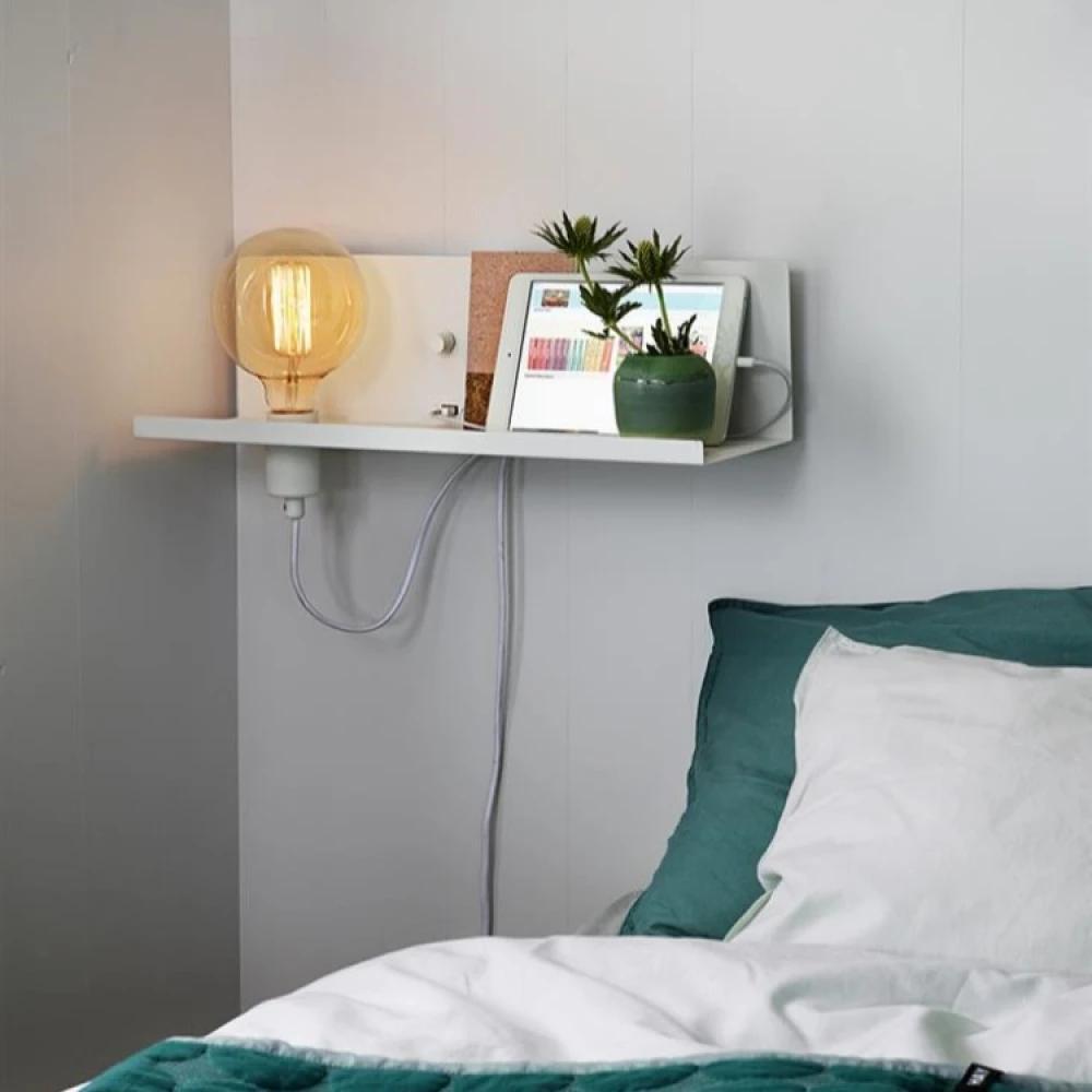 Hylden er forbundet til væggen og har et praktisk USB-stik, du kan oplade din mobiltelefon eller tablet. Du kan skrue en lysdæmperkompatibel pære ind i lampefatningen og få lidt ekstra belysning i rummet. Du styrer lysstyrken med den lille dæmperkontrol midt på hylden.