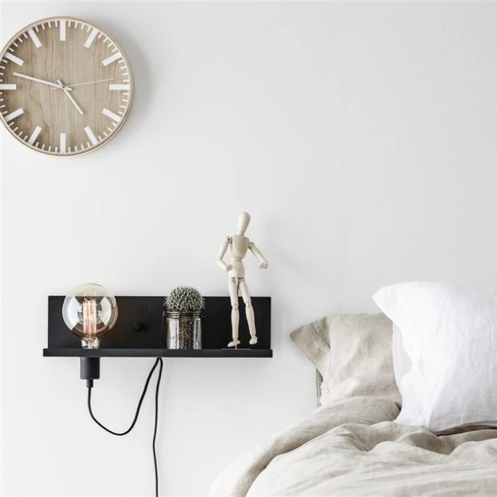 Væghylden har et 2 meter langt tekstilkabel, som du sætter i en almindelig stikkontakt. Den hvide og guldfarvede væghylde har et hvidt/grå tekstilkabel. Den sorte væghylde har et sort tekstilkabel.