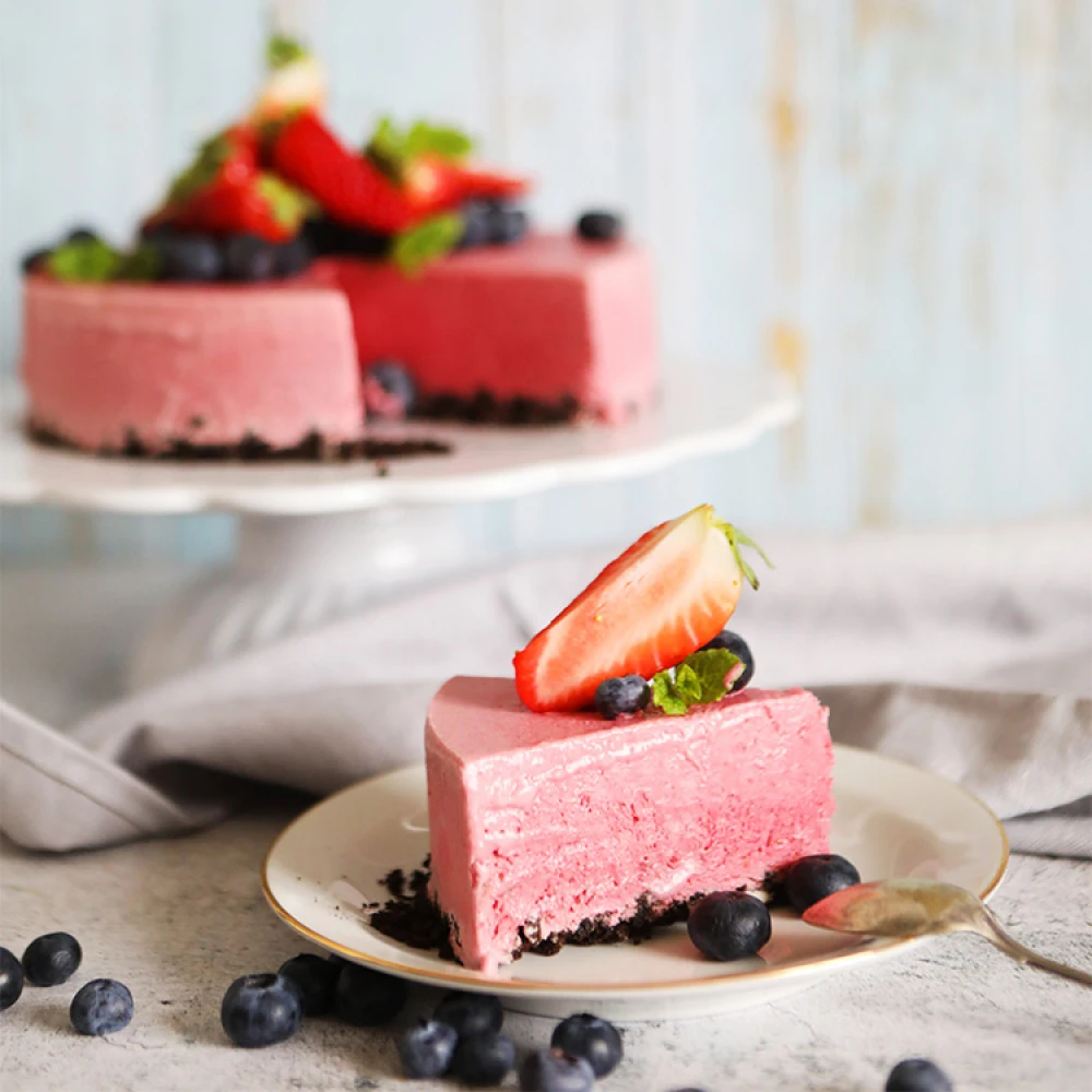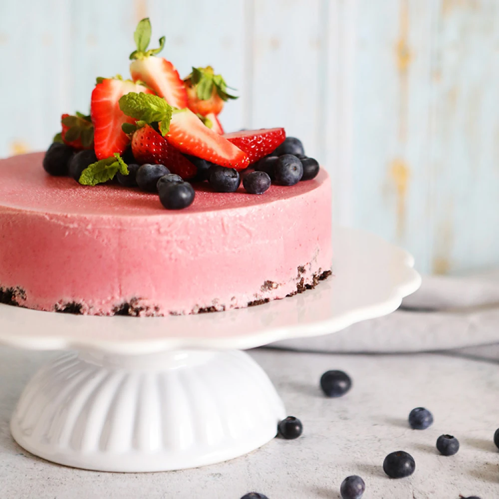 6. Tag ud af fryseren og varm formen op med et gasblus. Løsn spændet, og fjern formen. Pynt kagen med valgfrie bær. Lad den tø op i 15 minutter inden servering.