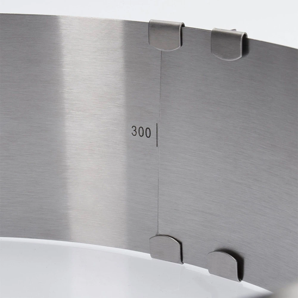 Ved hjælp af kageringen kan du også lave specialfremstillede kager og kagebunde i ovnen. Graderingen på indersiden giver dig mulighed for at justere ringen til den ønskede størrelse. Kageringen har ingen bund men kan lægges på et bagepapir for at holde tyktflydende dej i formen.