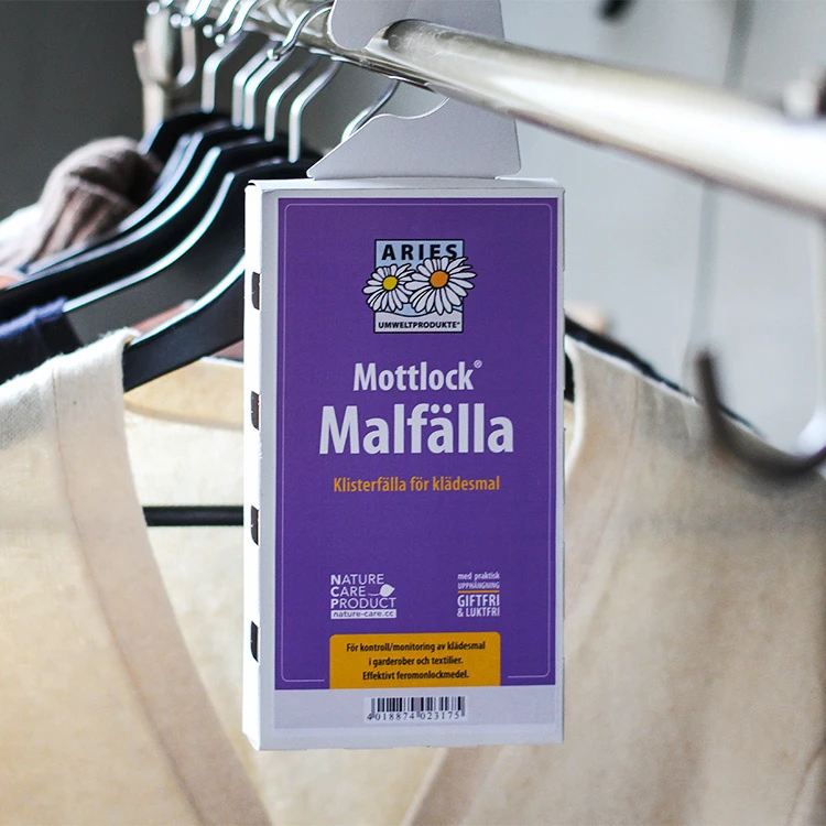 Effektiv og giftfri klæbefælde mod møl, der tiltrækker hannerne og fanger dem på et stærkt klæbende papir. Fælden virker mod de mest almindelige varianter af pels- og tøjmøl og hænges nemt op blandt dit tøj i skabet med en krog.