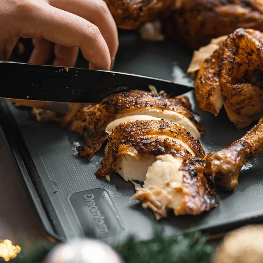 Undersiden af skærebrættet er praktisk at bruge, når du skærer kød i skiver, skærer frisk brød eller skærer tomater, meloner og andre frugter op med en masse væske i. Kanterne skaber en voldgrav, der fanger både væske og brødkrummer. Det bliver rent på køkkenbordet og du kan nemmere udnytte væsken eller krummerne, der bliver tilovers.