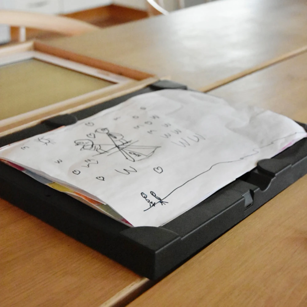 Med Li’l DaVinci kan du nemt ramme dine børns tegninger, skolebilleder, plakater og andre billeder, som du ønsker at hænge på væggen. Rammen åbnes forfra, hvilket gør det super nemt at skifte mellem forskellige motiver og har desuden indbygget opbevaring til omkring 50 tegninger.