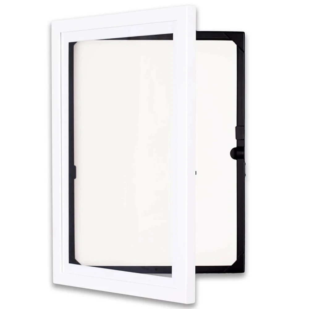 Den oplukkelige ramme fås i A3 og A4 format og du kan vælge mellem hvid, sort eller træramme. Skruer og vægbeslag medfølger i begge størrelser. A4-rammen kommer også med et lille bordstativ.