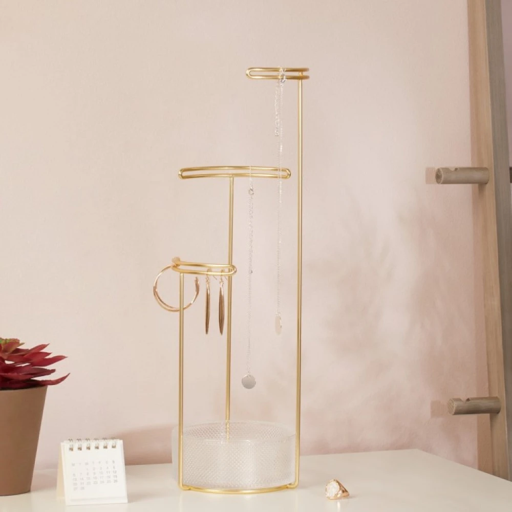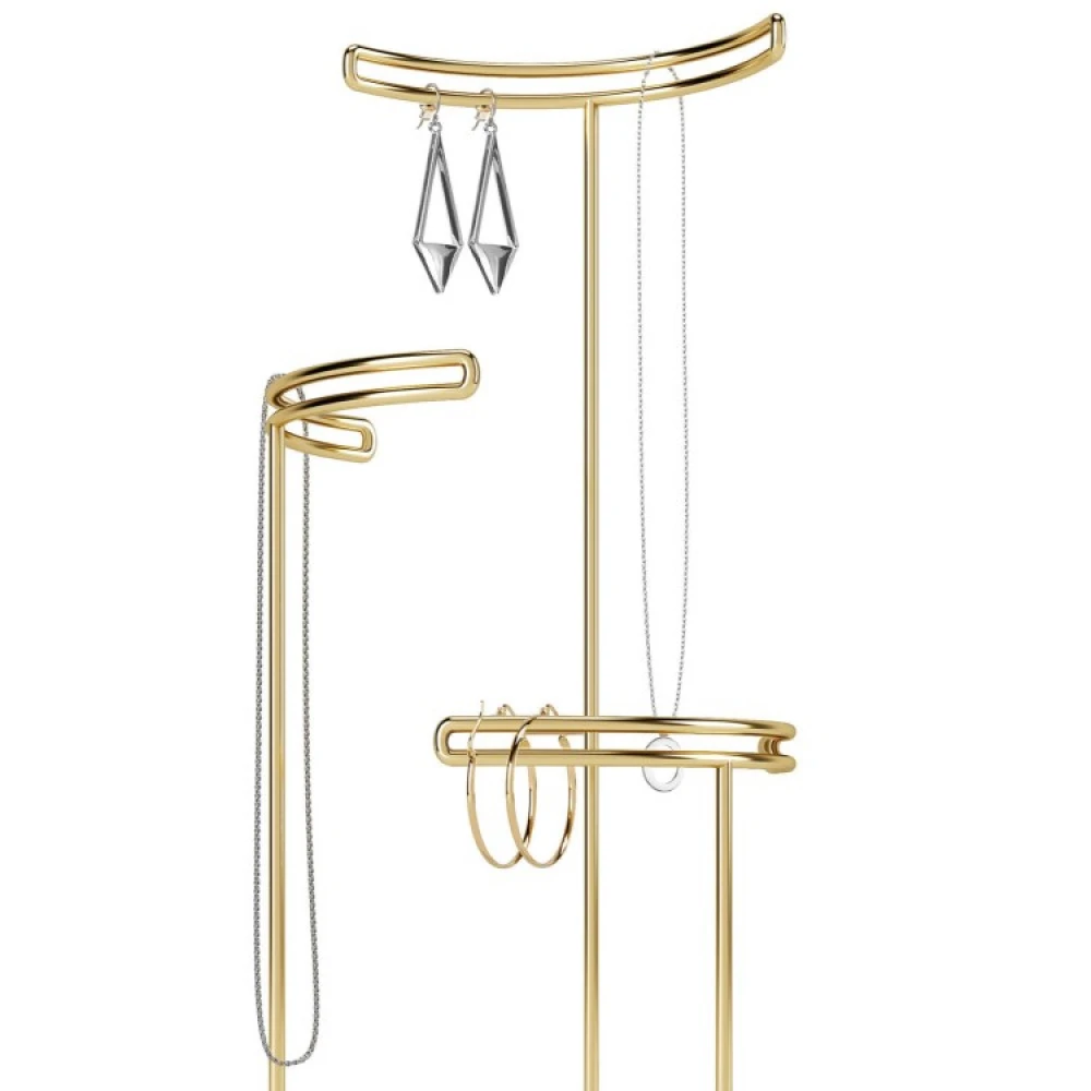 De tre holdere sidder i tre forskellige højder, så du kan hænge halskæder i alle længder. Hver holder har også et lille mellemrum, hvor du kan hænge dine øreringe op.