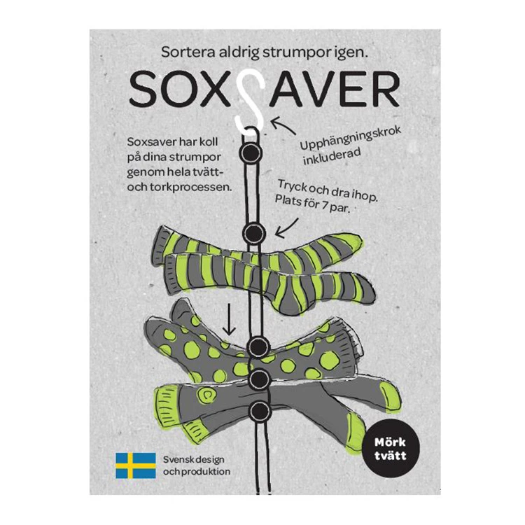 Med strømpehænger Soxsaver bliver det super nemt at holde orden på hele familiens snavsede sokker! De snavsede sokker parres fra du tager dem af til de er tørret og det vil være nemt at rulle de rigtige par sammen når du er færdig med vask.