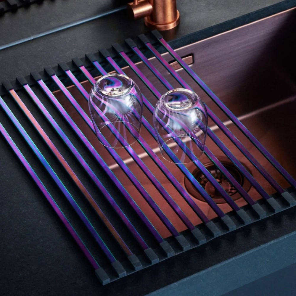 Når du ikke bruger tørrestativet, kan du blot rulle det sammen og opbevare det i en skuffe eller lægge det under vasken. Tørrestativet kan vaskes i opvaskemaskinen.