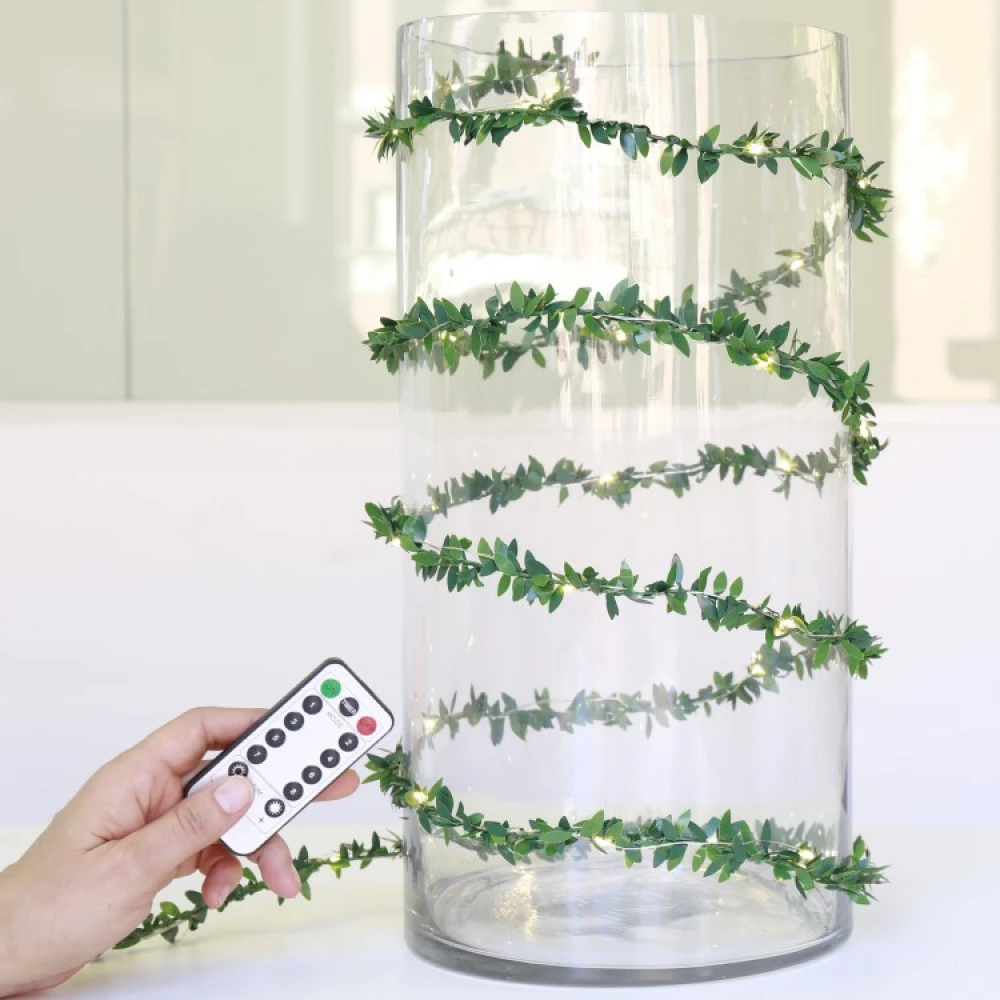 Denne USB-drevne lyskæde har smukke grønne blade og masser af små, varme hvide lys, som du nemt kan styre med den medfølgende fjernbetjening. Lyskæden er over tre meter lang og har en kobbertrådstang, så du nemt kan vikle sløjfen og dekorere din arbejdsplads, sofa eller bogreol.