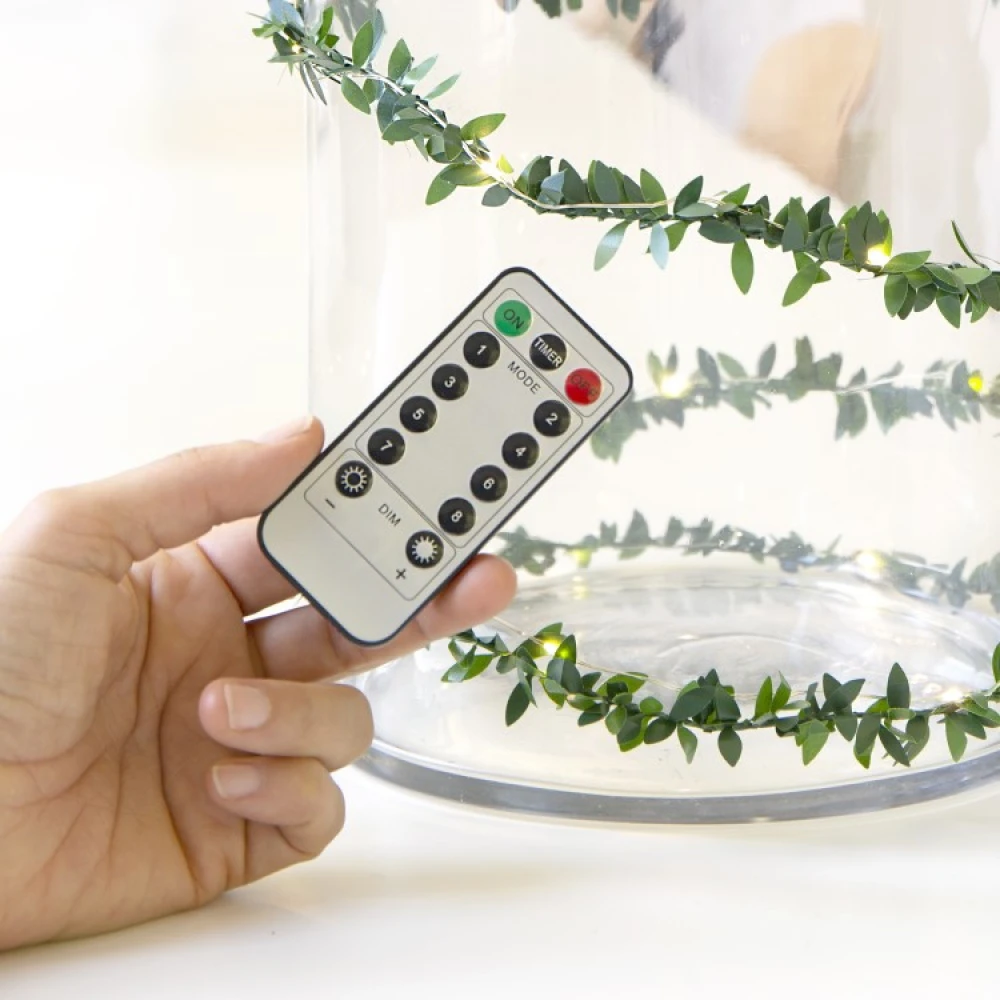 Fjernbetjeningen har også en timer-knap, der gør det muligt for lyskæden at tænde af sig selv på samme tid hver dag. Når du trykker på timerknappen, lyser lyssløjfen i 6 timer, hvorefter den slukkes i 18 timer, før den tændes den næste dag.