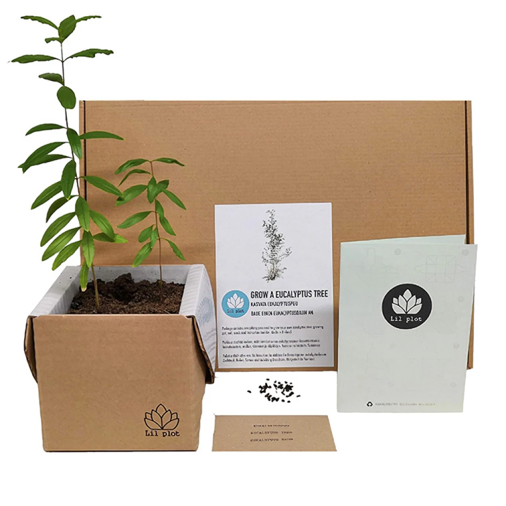 I trækittet får du frø, næringsrig jord og en vandtæt voksekasse i pap, som du dyrker træet i. Vælg mellem de forskellige trækit og dyrk dit eget eukalyptustræ, citrontræ eller granatæbletræ. De letdyrkelige indendørstræer er alle smukke planter og har desuden flere praktiske fordele. Eukalyptustræet giver en frisk og fresh duft og både citrontræet og granatæbletræet kan bære frugt allerede efter fem år!