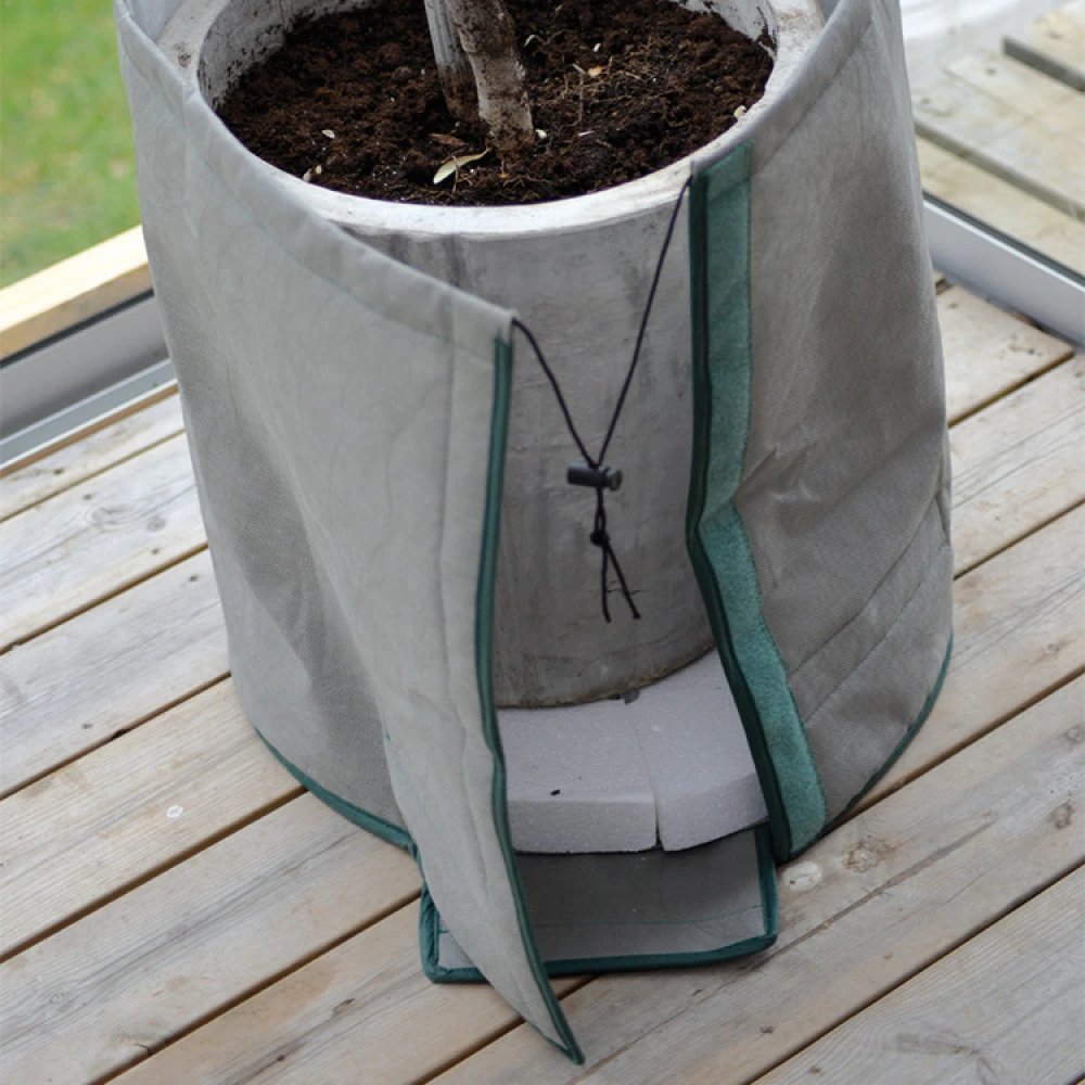 Vinterdækslet har en bundplade af styrofoam, der forhindrer kulden i at krybe op fra undersiden og giver en god isolering mod kolde gulve på altaner og terrasser. De bobleplastlignende, isolerende sider lukkes med velcro. Endelig er jorden og potten også bedre beskyttet fra toppen ved at trække snoren sammen.